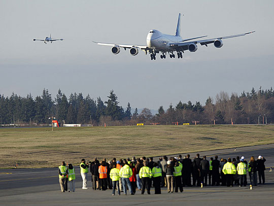 图为波音747-8客机试飞。