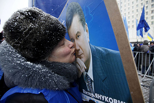 图为支持乌克兰反对党“地区党”领导人亚努科维奇的群众在亲吻选亚努科维奇画像。