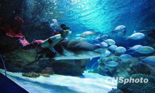 图为沙虎鲨与潜水员共同排练。中新社发 王志芳 摄