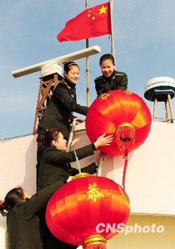 2月9日, 长年驻守在东海前哨的浙江玉环县坎门英雄基干民兵营哨所的女民兵们,忙碌地在营房内张贴春联、悬挂大红灯笼,喜迎虎年新春到来。她们满怀豪情地表示,要尽心尽责为祖国站好岗。