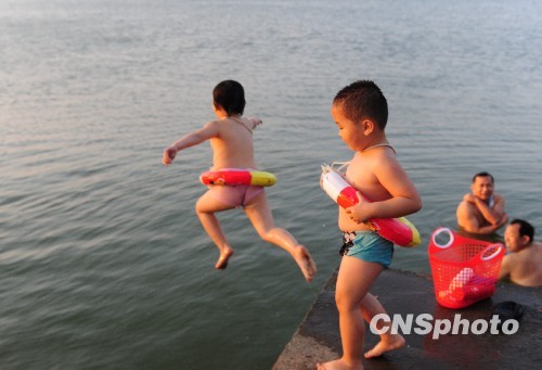 2010年2月9日,海南琼海,二位孩子跳进万泉河中戏水纳凉。农历立春前后,海南持续出现艳阳高照的好天气,气温保持在30度左右,部分地区最高气温近35度,融融春日犹如盛夏降临。据气象预报,这样的好天气还将持续几天。中新社发 蒙钟德 摄