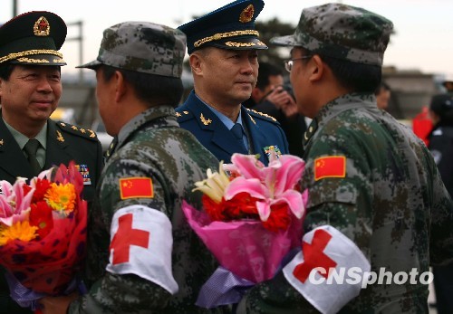 2月10日上午,中国赴海地医疗防疫救护队搭乘包机返抵北京首都国际机场。解放军副总参谋长马晓天等到机场迎接。中新社发 宋吉河 摄