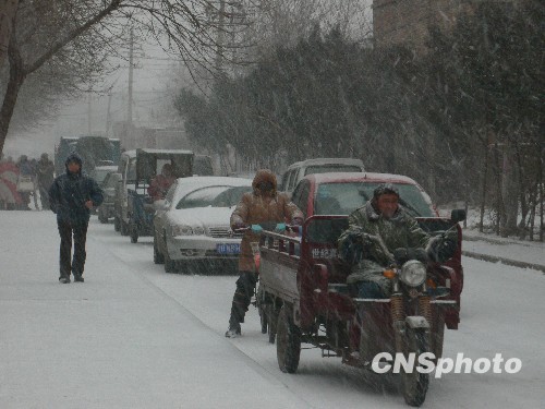 2月10日下午,人们在河南省开封市街头冒着大雪艰难行进。当日下午,河南省开封市突降大雪,给道路交通带来很大不便。