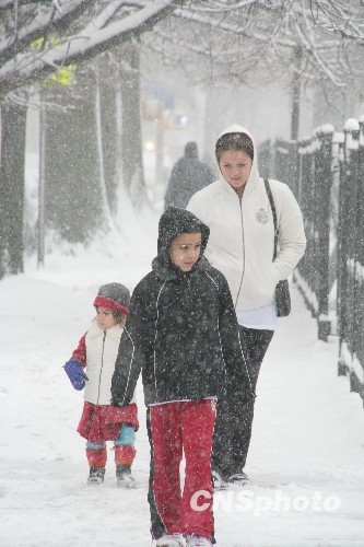 新一轮暴雪9日晚再度袭击美国东部地区,纽约市也笼罩在大风雪中,学校停课,110万学生放假在家。图为纽约一名妇女带着自己的孩子们在风雪中前行。中新社发 魏晞 摄
