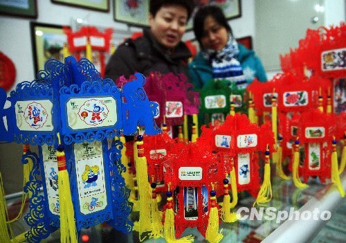 2月11日,游客在石家庄河北民俗博物馆欣赏参展2010上海世博会的藁城宫灯。作为河北一项重要的非物质文化遗产,藁城宫灯研制开发中心自主研制的世博元素纸雕宫灯已成为上海世博会特准商品,组委会还决定采用藁城宫灯装点中国元素馆。据博物馆工作人员介绍,参展的纸雕宫灯共6款,分别包含了上海世博会吉祥物、世博会场馆、12大上海风光及上海市花白玉兰等元素。中新社发 翟羽佳 摄