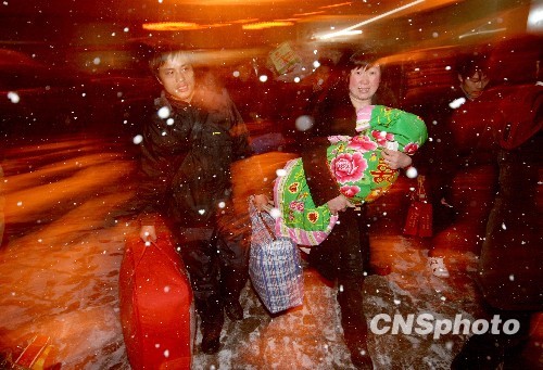 中国10日迎来了一场大范围的雨雪天气过程,甘肃、宁夏、陕西、山西、河北、河南、山东、安徽、江苏等地将遭遇大到暴雪袭击。中国气象局已迅速启动重大气象灾害Ⅳ级应急响应。 图为2月10日晚9时40分,迎着夜色中飘舞的雪花,一位母亲抱着孩子走出河南商丘火车站。当日,一股较强冷空气给河南大部分地区带来暴雪,春运高峰遭遇暴雪袭击。 中新社发 魏文慧 摄