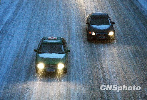 2月11日凌晨,江苏省南京市迎来降雪,路面结冰,给市民的生活和出行带来一定影响,江苏省气象台发布道路结冰橙色预警。 中新社发 钟山 摄