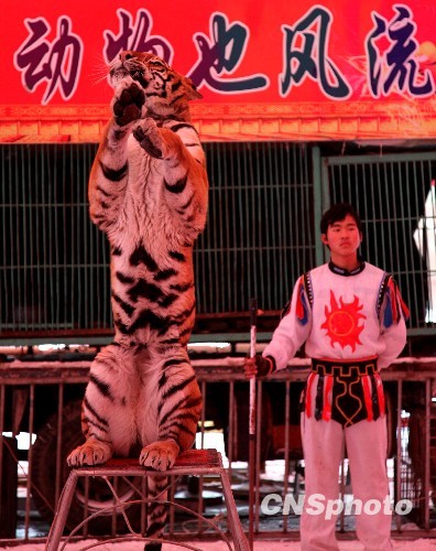 在河南许昌灞陵桥景区内,驯兽师在训练老虎进行拜年动作。中新社发 牛书培 摄