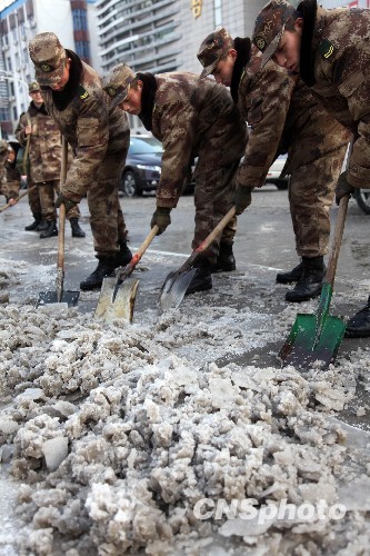 驻河南许昌某部官兵在市区八一路铲雪,确保道路畅通。中新社发 牛书培 摄