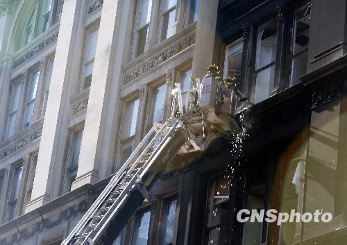 图为消防员正在清理爆炸后震碎的窗玻璃碎末。中新社发 孙宇挺 摄