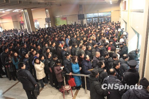 2月11日,2000余名市民在牡丹江火车站大厅内排队等候购票。中新社发 庄文斌 摄