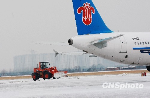 地勤人员在清除跑道上的冰雪。中新社发 李博 摄