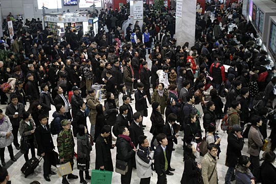 图为2月12日,韩国返乡民众在售票大厅内购票。