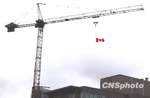 第21届冬奥会于加拿大当地时间2月12日正式开幕,位于温哥华市中心的一处工地为庆祝这一盛事,在一巨型起重机上悬挂加拿大国旗。中新社发 赖海隆 摄