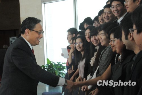 图为当日周文重与前来送行的中国留学生握手致意。中新社发 李静 摄