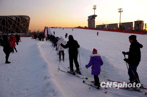 中外游客在鸟巢尽享寒冬乐趣。中新社发 陈文 摄