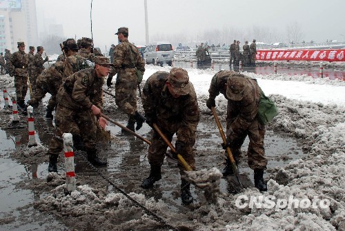 2月14日,南京市气象台发布道路结冰黄色预警信号,局部降雪厚达10厘米,城区交通干道及长江二桥、三桥积雪严重,通行困难,为了让驻地群众过一个欢乐祥和安全的春节,南京军区派出6500多名驻宁官兵,出动大型扫雪装备,赶赴南京市主要交通枢纽扫雪除冰,军区政委陈国令更是亲临指挥。