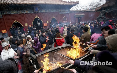 2010年2月15日,是中国旧历新年的大年初一,在北京雍和宫很多市民早早的前来此地烧香祈福。每逢新春,特别是在大年初一、十五上香的日子,雍和宫的香火鼎盛、人潮汹涌。由于北京人大多相信在雍和宫祈福许愿比较灵验,因此雍和宫香火之盛令京城其它寺院望尘莫及。雍和宫,最早为康熙四子胤禛的“禛贝勒府”,后来,康熙进封他为“硕雍亲王”,贝勒府自然就升格为王府,并按照王府的礼制扩建,后来,康熙驾崩,雍正皇帝即位,这里作为“潜龙禁地”而一跃成为雍正的行宫,更重要的是,至此,此处才有了现在的名字——“雍和宫”。所以,雍和宫虽说寺院,但它的名号,不是寺、不是院、不是刹,而是宫。