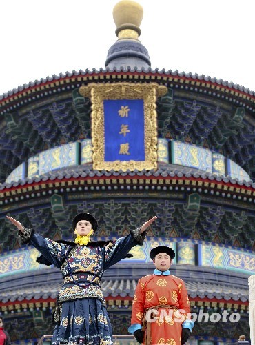 2月14日,在北京天坛公园祈年殿前祭天乐舞表演再现了清乾隆十三年祭天盛典。当日,北京第六届天坛文化周正式启动。从2010年2月14日—2月18日(农历大年初一至初五),北京天坛公园依据清乾隆十三年的卤簿仪制,进行祭天仪仗、祭天乐舞展演,再现清乾隆十三年祭天盛典。游客不仅可以领略昔日皇家祭天的隆重场面,同时可以倾听祈福迎祥的天籁之音。天坛始建于公元1420年,是世界上现存最大的祭天建筑群,是明、清两朝皇帝举行祭天大典的场所,在历史上共有22位皇帝先后在此举行过654次祭天大典。清代祭天仪仗由导象、宝象、车驾、乐队、禁军、八旗军、皇帝御前侍卫、内廷侍从、文武百官等组成。而祭天乐舞则是献给上天的舞蹈,已流传千年。据了解,祈年殿大型祭天乐舞表演分为三场,演出人员达280余人。祭天盛典表演在服装道具、礼仪规制上保持原真性,这样可以让中外游客真实体验恢弘的皇帝祭天仪式,感受古朴的祭天乐舞表演。