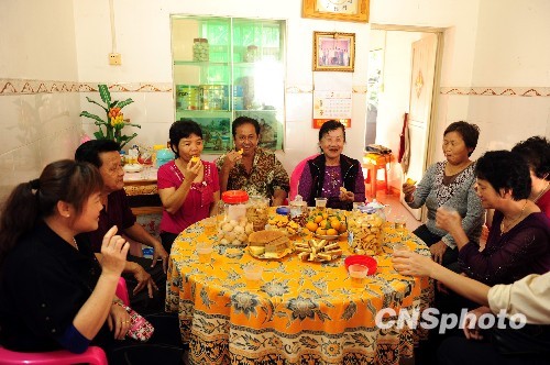 村民围座在一起品尝糕点欢度新春。中新社发 蒙钟德 摄