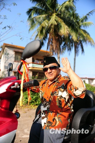 一位穿着印尼传统服装的村民骑摩托车在村里休闲兜风。中新社发 蒙钟德 摄