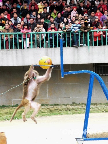 2010年2月15日,大年初二,广西南宁动物园用猴子扣篮表演吸引游客。