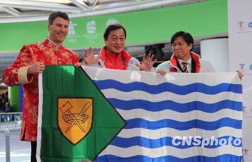 身着传统中式服装的温哥华市长罗品信向中国国家体育总局冬季运动管理中心副主任任洪国及中国花样滑冰总教练姚滨赠送了温哥华市旗。