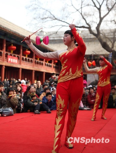 春节期间,北京东岳庙春节文化庙会上的演员们身手不凡,各怀绝技。他们为游客表演的“高车踢碗”、“抖空竹”、“变脸”、“柔术”等精彩杂技,令众多游客拍手称绝。中新社发 陈晓根 摄