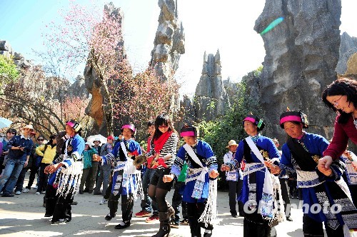 图为游客与当地民族载歌载舞。 中新社发 李兰英 摄