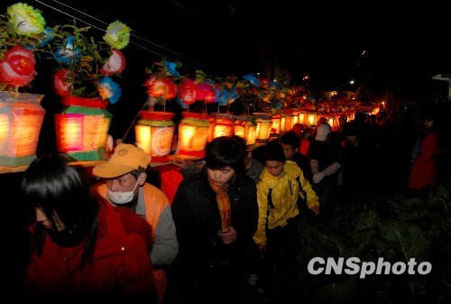 在江西婺源县清华镇清华村街头,一条长120余米,由300多个花灯和上百条板凳连接组成的板龙灯亮相,吸引着许多村民和游客前来观看。中新社发 王国红 摄