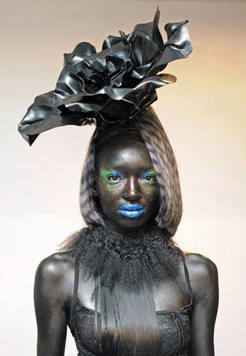 图为模特在伦敦时装周上展示设计师Charlie Le Mindu的服饰。