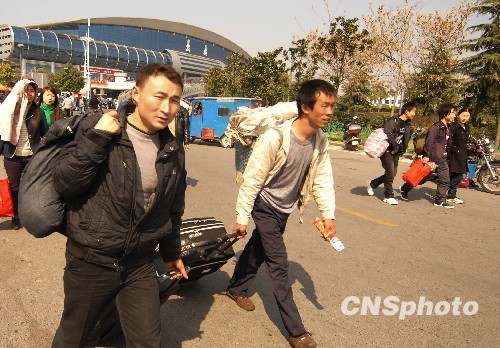 2月20日,返程民工有序走出铁路义乌站出口。有着100多万外来务工人员的浙江省义乌市,随着企业的陆续开工,春节前回家的外来务工人员陆续开始返程,纷纷赶在企业开工时准点上班。据铁路义乌站工作人员介绍,从2月19日开始迎来民工返程高峰,许多在诸暨、嵊州、浦江、东阳等周边县市务工的外省民工也选择义乌站下车中转。为此,铁路义乌站在上岗人员、车辆等方面作了充分的安排,基本上能达到当日客流及时转运。
