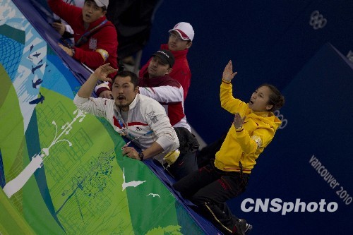 图为中国主教练李琰在场边为周洋(右一)加油。中新社发 盛佳鹏 摄