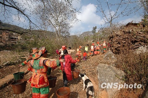 图为蒙自西北勒乡罗锅底村的民众挑水自救。中新社发 薛云 摄