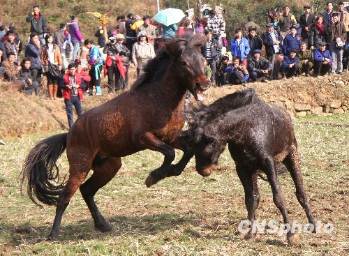 2月19日,在广西融水苗族自治县安太乡培地苗寨,两匹骏马在进行激烈的拼搏。当日是大年初六,该县安太乡培地苗寨举行斗马比赛,近20匹骏马的撕、咬、踢、追等激烈的搏斗,吸引众多苗、侗等少数民族同胞到场观看,整个苗寨成了欢乐的海洋。