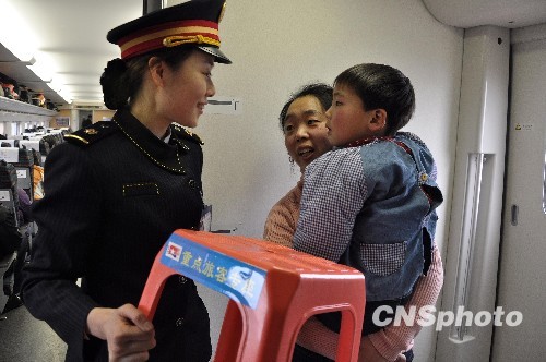 列车长为带孩子的旅客送去“爱心凳”。 中新社发 邢欣 摄