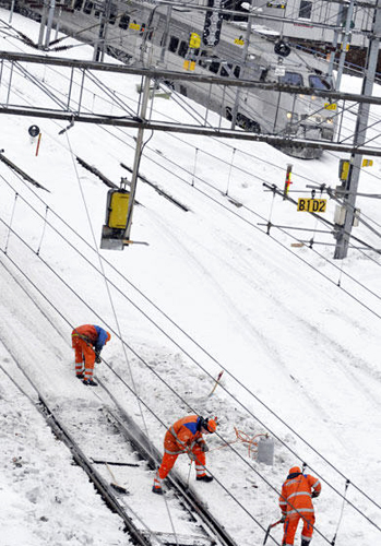 图为2月21日瑞典首都斯德哥尔摩的中央火车站,铁路工作人员清理轨道上的积雪。