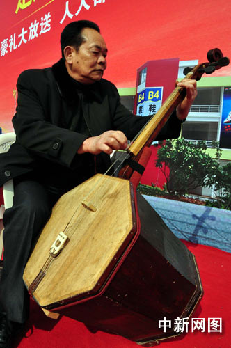图为2月21日,莆田市余荣烈老人在“民俗文化周”上展示一把特大的民间乐器——老胡。林剑冰 摄