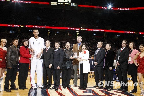 2010年2月21日,由美国东部地区百多家社团联合主办的2010“中华之夜”虎年新春在NBA新泽西篮网队主场举行。这是NBA球队连续第二年在球赛期间举行大规模中华文化盛会,与华人共庆传统新春佳节。晚会上,来自中国的NBA球员易建联(左四)、网队主教练范德维奇(左八)还分别获得主办方特别颁发的“美中友好使者奖”和“美中友谊使者奖”,以表彰他们多年来在促进美中体育文化事业交流、推动美中友好关系上的贡献。中新社发 魏晞 摄