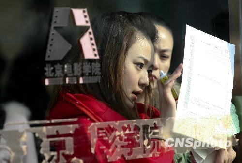 2010年2月22日,报考北京电影学院表演系的学生们填写报名表。一年一度招生热,又是一年艺考时。艺术院校的招生考试一直是追逐艺术梦想的年轻人亮相的热闹舞台,竞争十分激烈。二三月份,正是艺术类招生最密集的时候,春节刚过,艺术类考生就开始忙着赶场面试,从21日开始,北京电影学院、中央戏剧学院、中国传媒大学、中国美术学院诸多艺术类院校、专业正同时进行着招生报名考试,场面依然火爆。