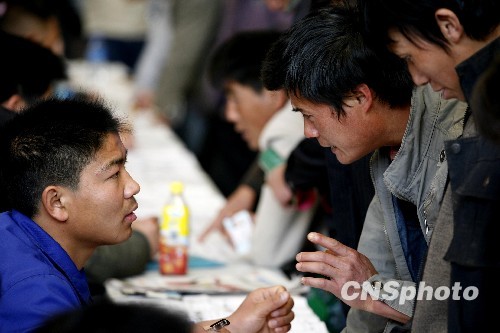 图为2月22日,在与招聘人员(左)交谈的农民工(右)。中新社发 刘冉阳 摄