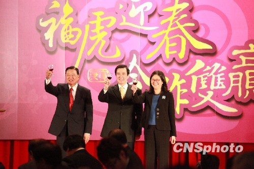 2月22日,“2010大陆台商春节联谊活动”在台北圆山大饭店举行,100多位大陆各地的台商会长与会。图为国民党主席马英九、台湾海基会董事长江丙坤、台湾“陆委会”主委赖幸媛在主席台上为台商敬酒,祝贺大家新年虎虎生风、万事顺利。中新社发 闫晓虹 摄