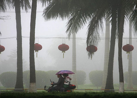 2月22日,海口市笼罩在大雾中,能见度小于500米、大于等于200米。张杰/CFP