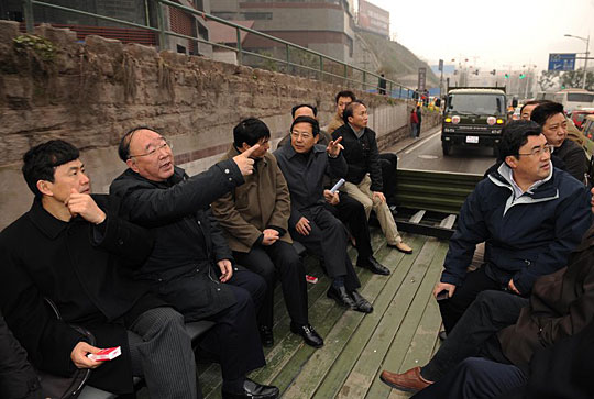 2月22日,黄奇帆等重庆市领导与相关部门负责人乘坐大卡车考察主城主干道综合整治改造项目。
