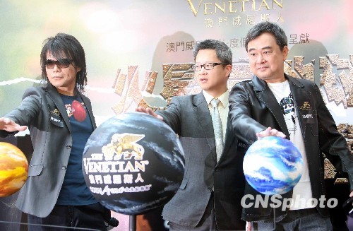 2月23日,台湾著名音乐人伍佰(左)与陈升(右)在香港朗豪坊出席记者会,为4月中旬在澳门威尼斯人度假村举行的“伍佰 X china Blue X 陈升火星撞地球澳门演唱会2010”宣传。中新社发 洪少葵 摄