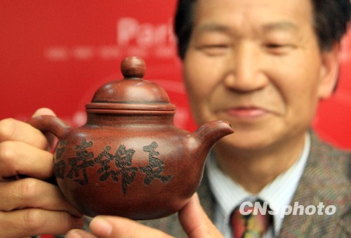 2月23日,一只获得1915年美国旧金山巴拿马万国博览会金奖的中国紫砂壶,从美国远渡重洋到上海参加《中国恒好全球百年世博收藏展》。该紫砂壶历经百年,却保存完好,为美国华人收藏者谢颂军的珍藏,也是2月26日在上海开幕的《中国恒好全球百年世博收藏展》中精品之一。中新社发 潘索菲 摄