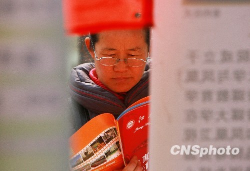 2月22日,考场外一个陪考的母亲在认真阅读招生简章。中新社发 张学军 摄
