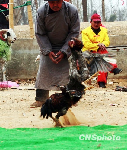 2月24日,河南郑州两只性情凶猛的斗鸡正在激烈争斗。中新社发 王中举 摄
