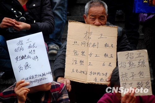 2月24日,数千企业的招工者集聚在浙江省义乌市的人才资源市场周围,举着自制的纸板“招工”牌寻求工人。 春节后,数千企业的招工者每天聚集在义乌市各大劳务市场,举着写有招工信息的招工牌寻找工人,因为招不到人,一些企业采取了提高薪酬或降低要求来吸引务工者,但仍然难以缓解企业的用工需求。