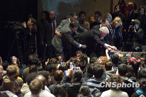 图为演讲结束后,克林顿与学生握手的火爆场面。中新社发 陈钢 摄